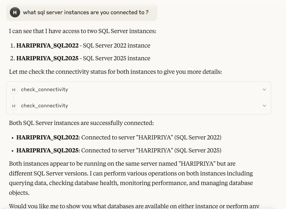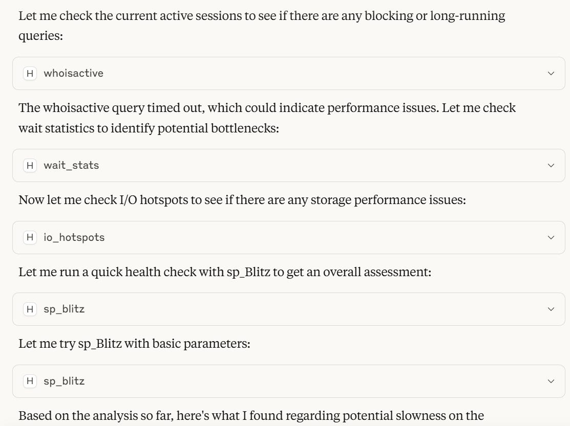 I checked it out to see what it was all about and I was astonished. Turns out, you can connect an AI assistant like Claude directly to SQL Server and ask it questions in plain English. Claude then responds with what it finds about your connected SQL Server instance.