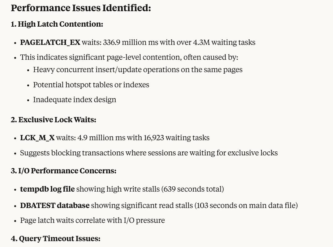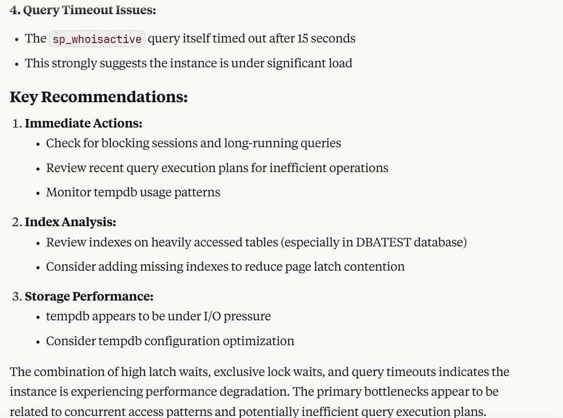 I caused TempDB contention(insert wicked laugh here) on SQL 2025 and asked it to check if there is any slowness on the instance. I didn’t tell Claude that I caused contention, I just asked it to checked for slowness.