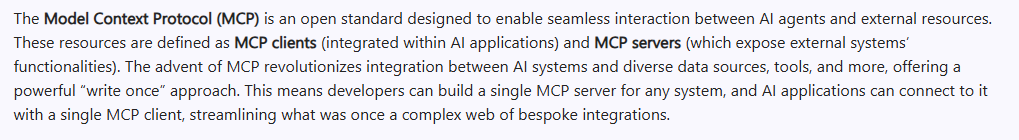 In simple English, it is a medium that lets AI interact with other tools, the tool in this case is SQL Server. So, for AI to talk to SQL Server, it needs MCP to do the interaction.