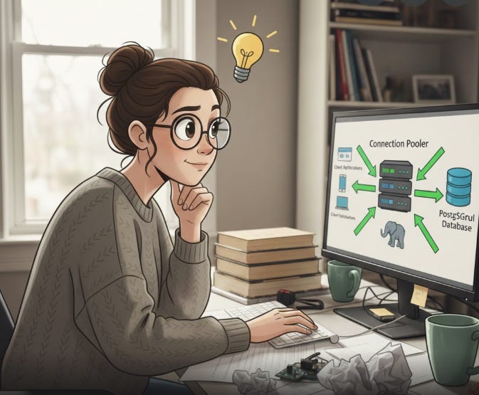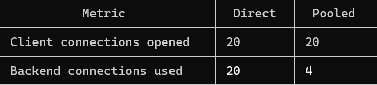With the pooler - the same 20 client connections needed only 4 backend processes, which is a 5x reduction in backend overhead.
